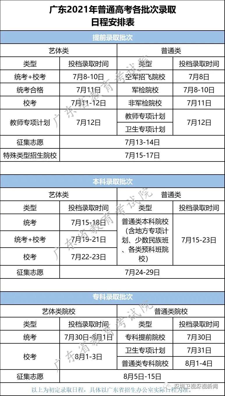 7月8日起,广东省2021年普通高校招生录取工作正式开始。招生录取分为3个阶段。其中,提前批为7月8~17日;本科批为7月15~29日;专科批为7月30日~8月15日。
