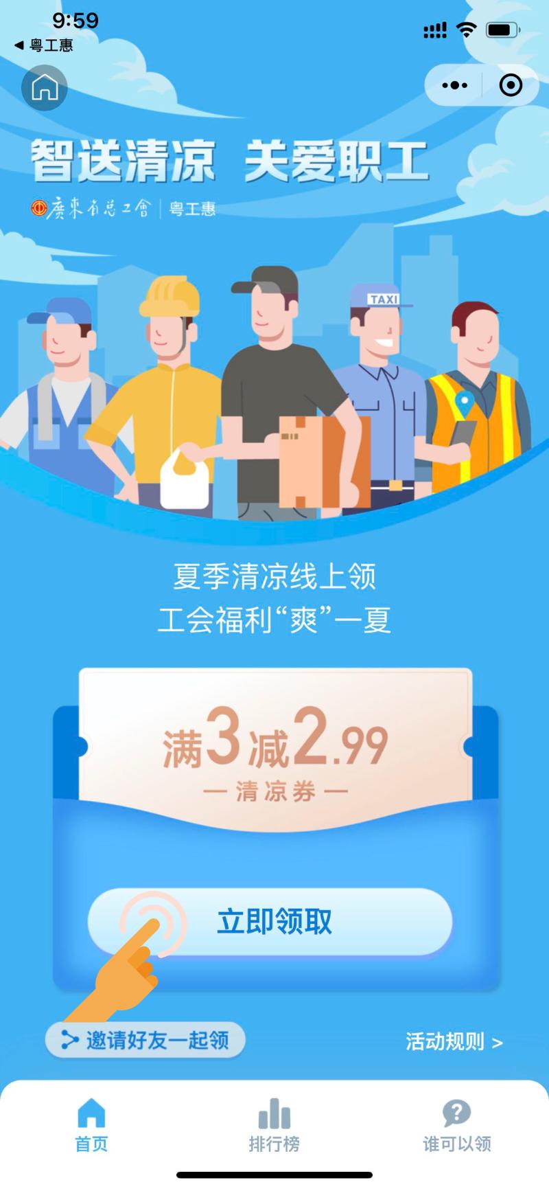 4.活动内容:活动开展期间,在“粤工惠”平台上已实名认证的活动对象,通过“粤工惠”平台每人每天可获得1张“满3元减2.99元”的清凉券,有效期3天。