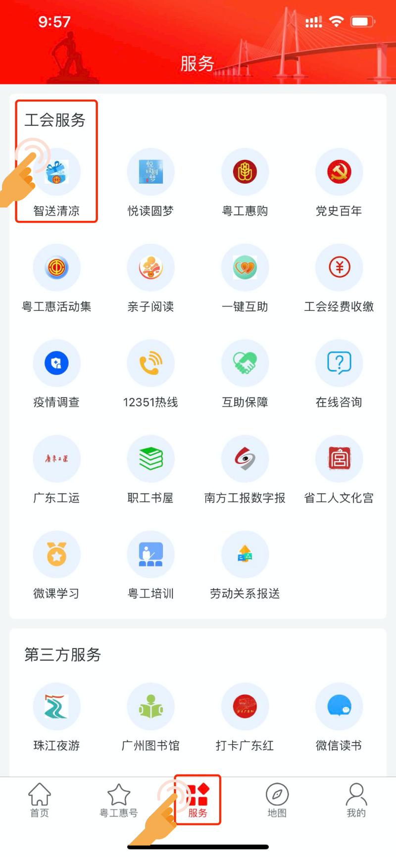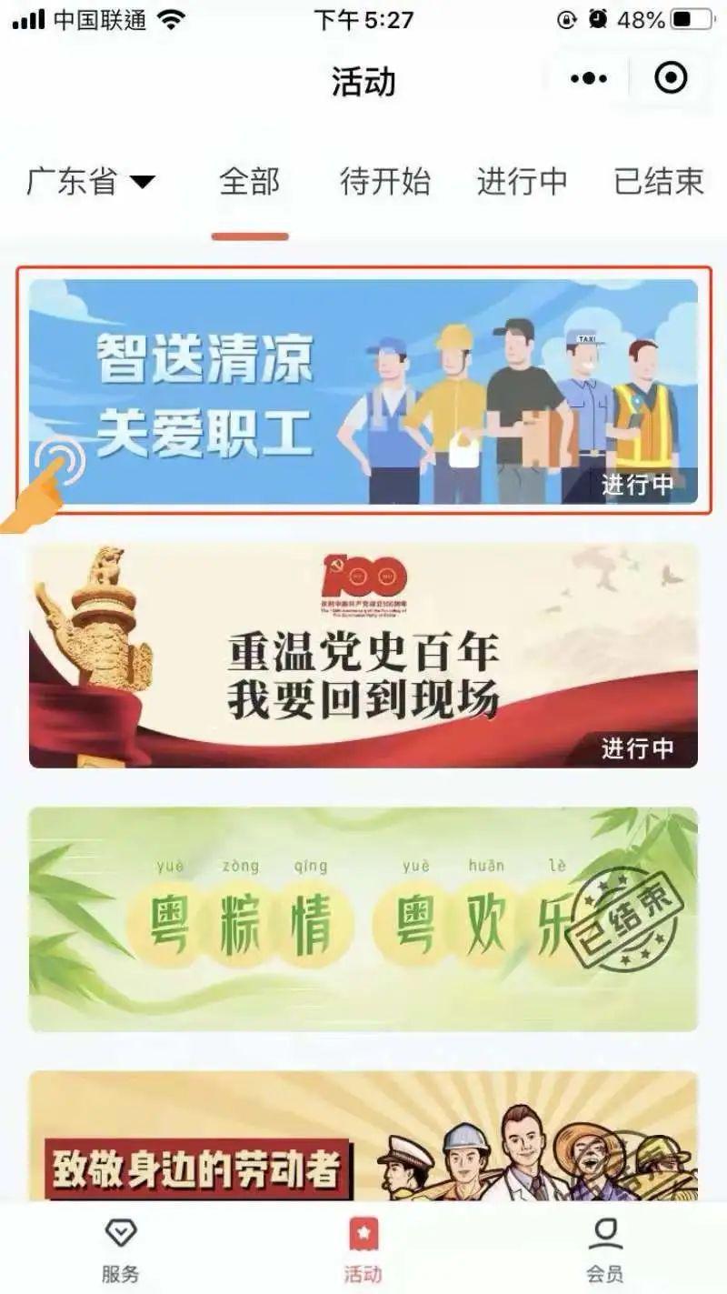 1)登录“粤工惠” App,进入工会服务,选择“智送清凉”活动按钮;