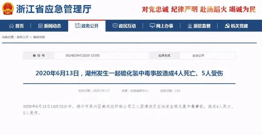 2020年6月13日14时许,浙江湖州市吴兴区美欣达印染公司工人因清洗反应池发生硫化氢中毒事故,造成4人死亡、5人受伤。