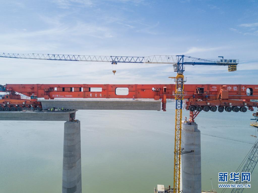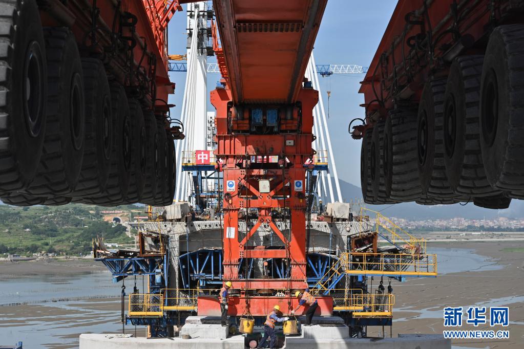 7月11日,在新建福厦铁路湄洲湾跨海大桥建设现场,中铁十一局工人协同“昆仑号”千吨级运架一体机架设该线路最后一孔40米箱梁。