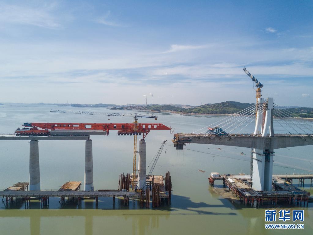 7月11日,在新建福厦铁路湄洲湾跨海大桥建设现场,“昆仑号”在架设该线路最后一孔40米箱梁(无人机照片)。