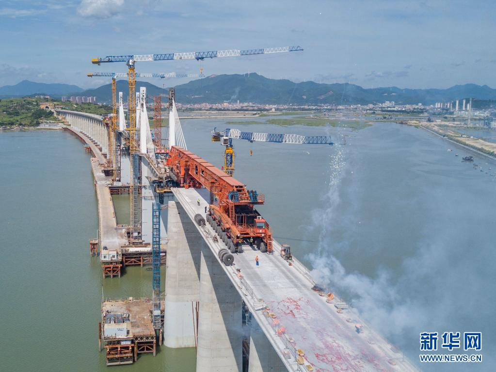 这是在新建福厦铁路湄洲湾跨海大桥建设现场,“昆仑号”千吨级运架一体机完成架梁任务后的庆祝场面(7月11日摄,无人机照片)。