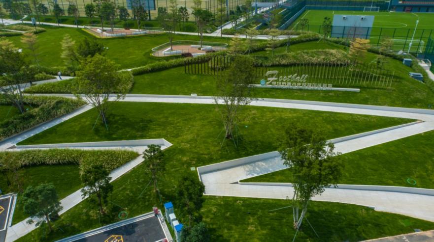 通过一条长约3千米的环形跑道连接8个不同高差的足球场地,并重点营造贯通主次入口的景观场所,设计团队摈弃既定方式,通过创新设计手段把高差难点转变成景观特点,引入“之”字形折线坡道的设计手法。