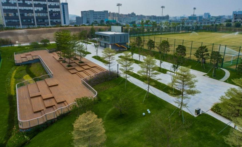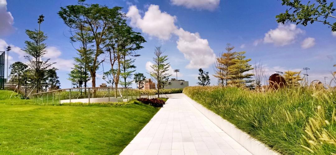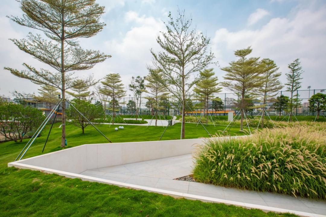 沿着“之”字形通道,凤凰木、锦叶榄仁、丛生朴树打造舒朗通透的绿荫林下空间。随风摇曳自然野趣的狼尾草、造型蓬松可爱的狐尾天门冬、柳叶马鞭草,营造了丰富明快的植物韵律。阶梯式竹木平台的设置,让市民无须入场便可观看顶级赛事,同时为市民举办多样化活动提供场所。
