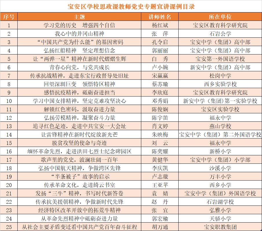 宝安区思政课教师党史专题宣讲团围绕党史学习教育重点,根据不同学段学情,经过多次研究讨论,建设了“百年风华”“光辉起点”“热血初心”“时代乐章”和“红色宝安湾”现场教学专题课等五大系列专题党课,开设了如《“中国共产党为什么能”的基因密码》《回望深圳巨变,领悟特区精神》《追寻红色足迹,走进中共宝安一大会址》等25堂党史专题课。讲好党的百年故事,发挥党史育人作用,教育引导青少年学生学史明理、学史增信、学史崇德、学史力行,牢固树立中国特色社会主义的道路自信、制度自信、理论自信、文化自信。