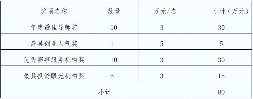 用于奖励在赛事参与过程中单项表现突出的企业、团队和个人,共80万元。