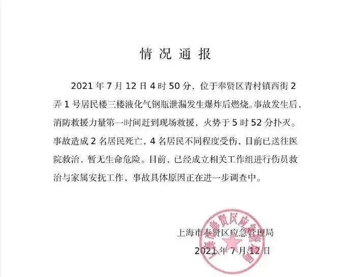 7月12日,上海市奉贤区应急管理局发布通报,当天4时50分,位于奉贤区青村镇西街2弄1号居民楼三楼液化气钢瓶泄漏发生爆炸后燃烧。