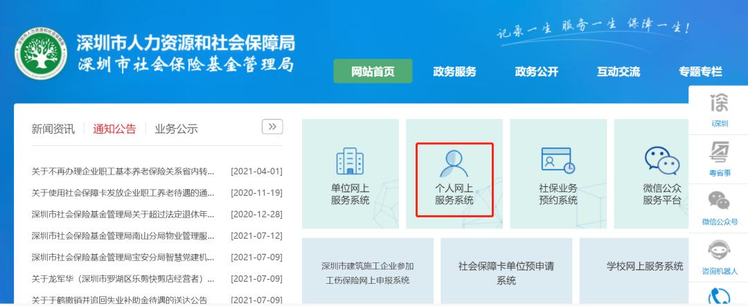 1.深圳市社会保险基金管理局官网→“个人网上服务系统”:https://sipub.sz.gov.cn/hspms/