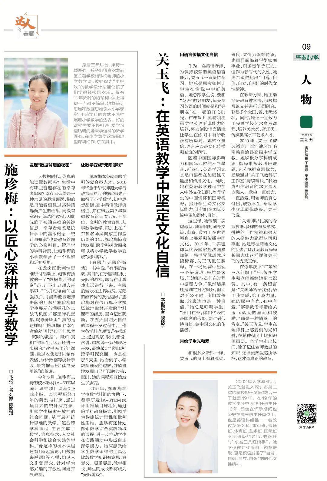 施珍梅本身就是跨学科的复合型人才。2010年毕业于华东师范大学行政管理专业的施珍梅先后取得了小学数学、初中思想品德、高中英语教师资格证,并在毕业第7年获得教育管理专业硕士学位。文科的教育背景,从事数学教学,再加上在广东省名师吴向东工作室历练的3年,施珍梅惊喜地发现,跨学科探索原来可以将小学数学教学变成“无限游戏”。