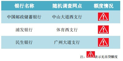“现在我们房贷没额度。”邮储银行中山大道西支行客户经理如是说;浦发银行体育西支行客户经理则表示该行“二手房按揭没额度”;民生银行广州大道支行客户经理也向记者表示:“我们这个月是没有额度的。”