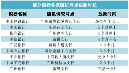 如平安银行中石化大厦支行客户经理称放款时间“没法准确保证”,至少3个月;招商银行广州荔湾支行、中信银行市桥支行则称放款时间在4个月左右;农业银行国际金融中心支行客户经理称,该行放款时间一般为3至6个月;广发银行黄埔大道支行放款时间为4至6个月。
