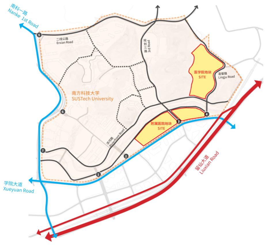 南科大当时在东区仅剩两块地可建。南科大的整个校园占地三千亩,但少一半是二线关,以北的地块是生态用地,不能用,以南的地块里有一条大沙河、两个引水渠、八个考古遗址,都是紫线,不能碰,所以能用来做建筑的面积非常有限。我们把基本上算是可建的最后两块地,包括南山智园对面靠近学苑大道的地块,把医学院和医院建在一起。这也是我们在国外考察时发现的。在美国,比较先进的医院和医学院基本上是挨在一起的,在中国,医院是医院,医学院是医学院,所以学生到医院有一定距离,需要乘坐交通工具。我们当时的概念是想把医学院和医院一起建在校园内,让病人前来看病时交通方便。这在国内是第一个把医院和医学院建在一座校园内的,当然现在深圳还有中山大学及附属医院和深大总医院。我觉得这对未来整个深圳的医疗版块会有一个比较大的促进。