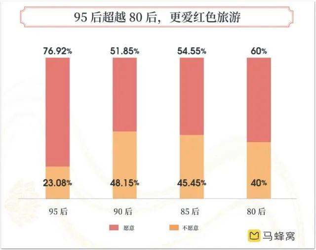 得益于大热的《觉醒年代》等红色影视作品,“Z世代”(1995至2009年出生的一代)也成为了“红色旅游”的生力军。马蜂窝大数据报告指出,76.92%的“95后”喜欢体验红色旅游线路。