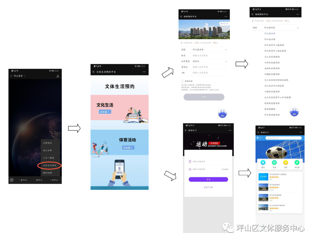 点击“悦生活”选择“文体生活预约”进入平台选择页面,市民可根据自身需求,选择“文化生活”或“体育活动”栏目进入相应的预约平台,“文化生活”预约平台将对接到原馆预约平台,预约方式不变,“体育生活”预约平台将对接到坪山体育中心的收费系统网上平台,市民注册后需实名认证方式可以进行预约或订场操作,认证完成后可实现网上直接预订相应场地并完成网上支付。