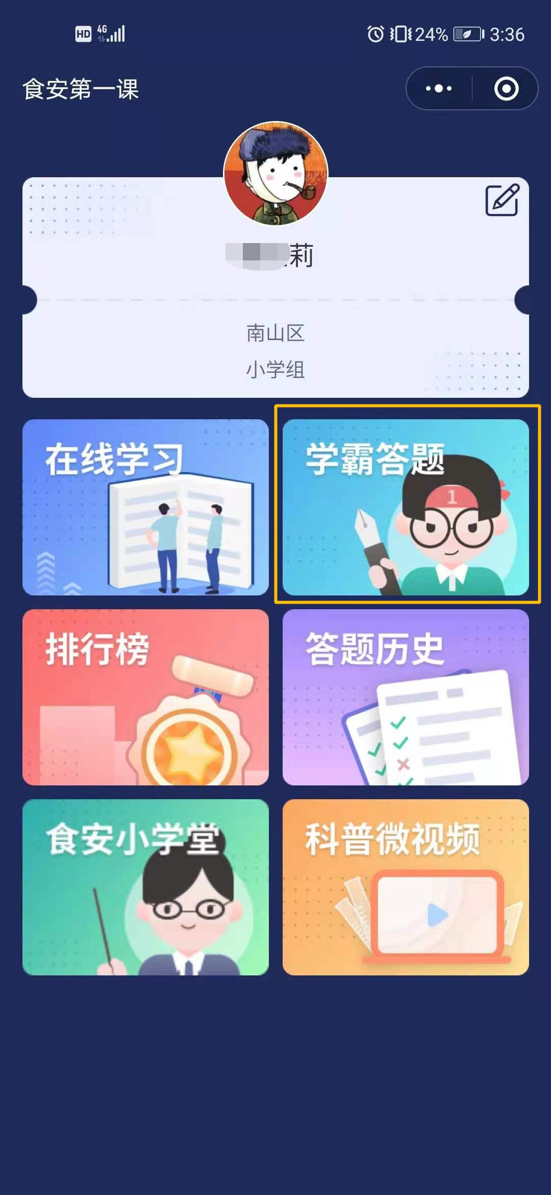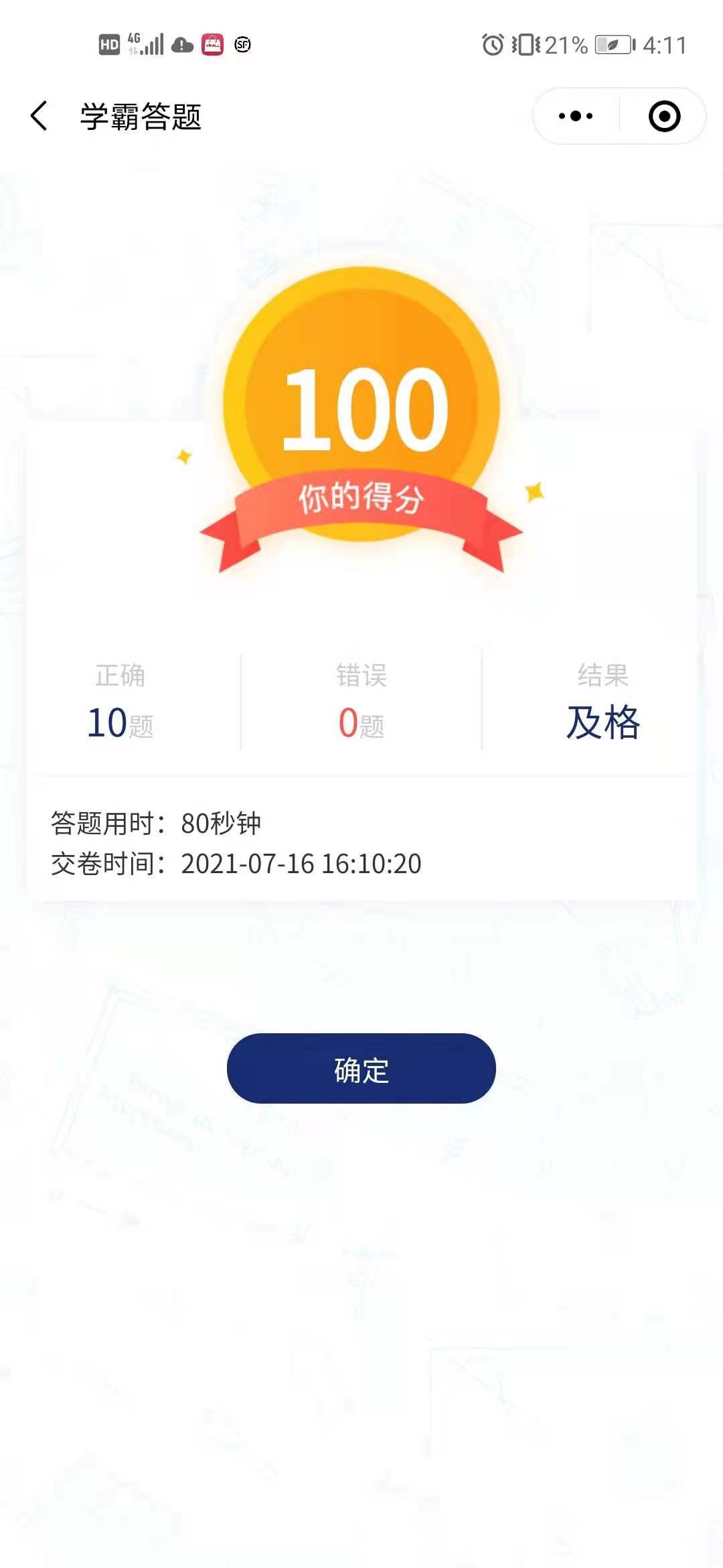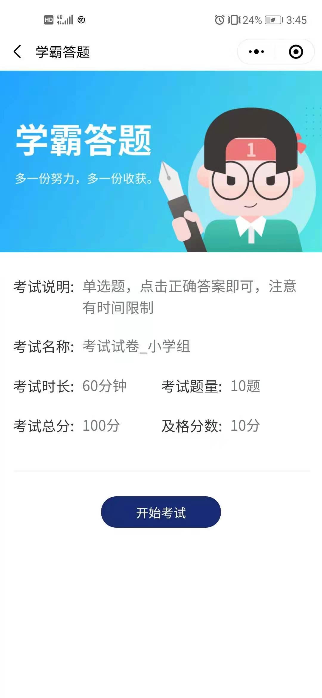 点击“学霸答题”即可进行正式测试,“学霸答题”的测试方式与“在线学习”相同,共有10道题,每题分值为10分,共100分,在规定时间内答完即显示分数。