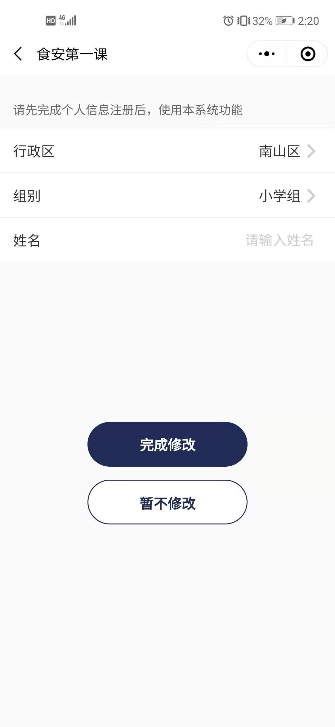 首次进入答题系统需要进行微信授权,请填写行政区位信息、组别以及姓名。