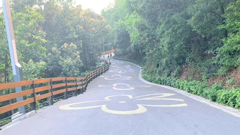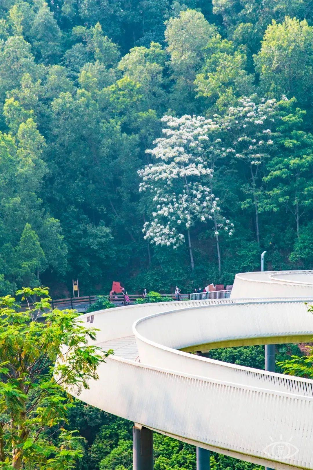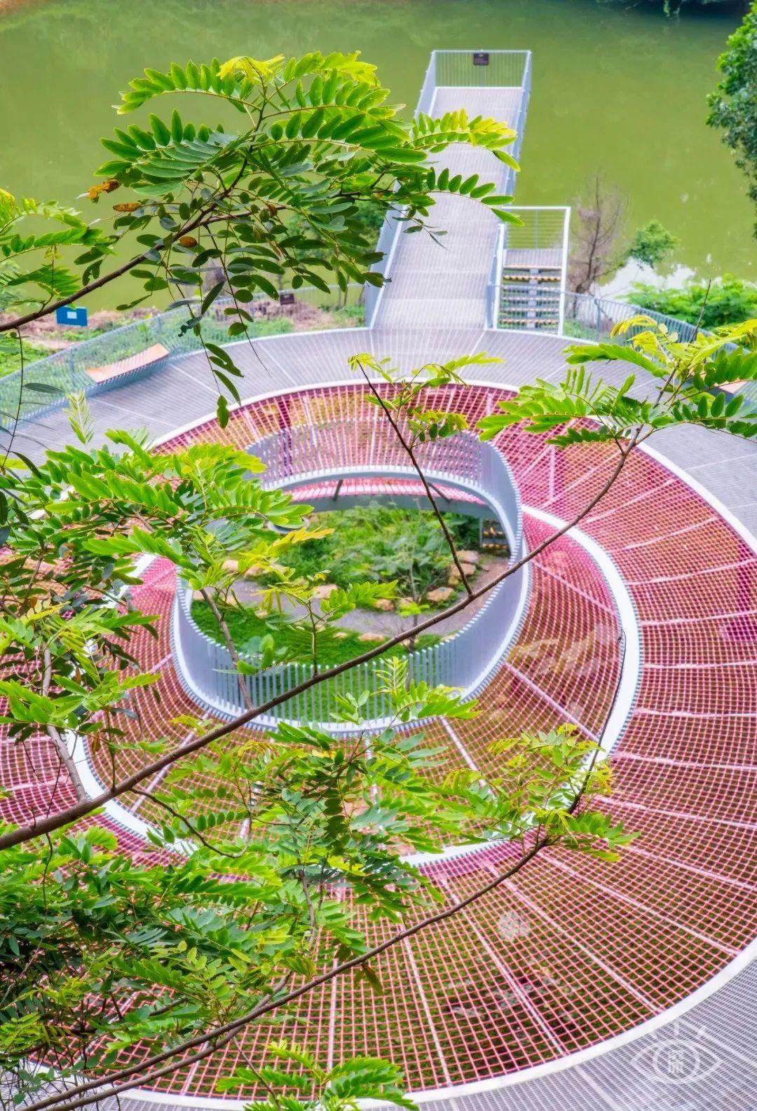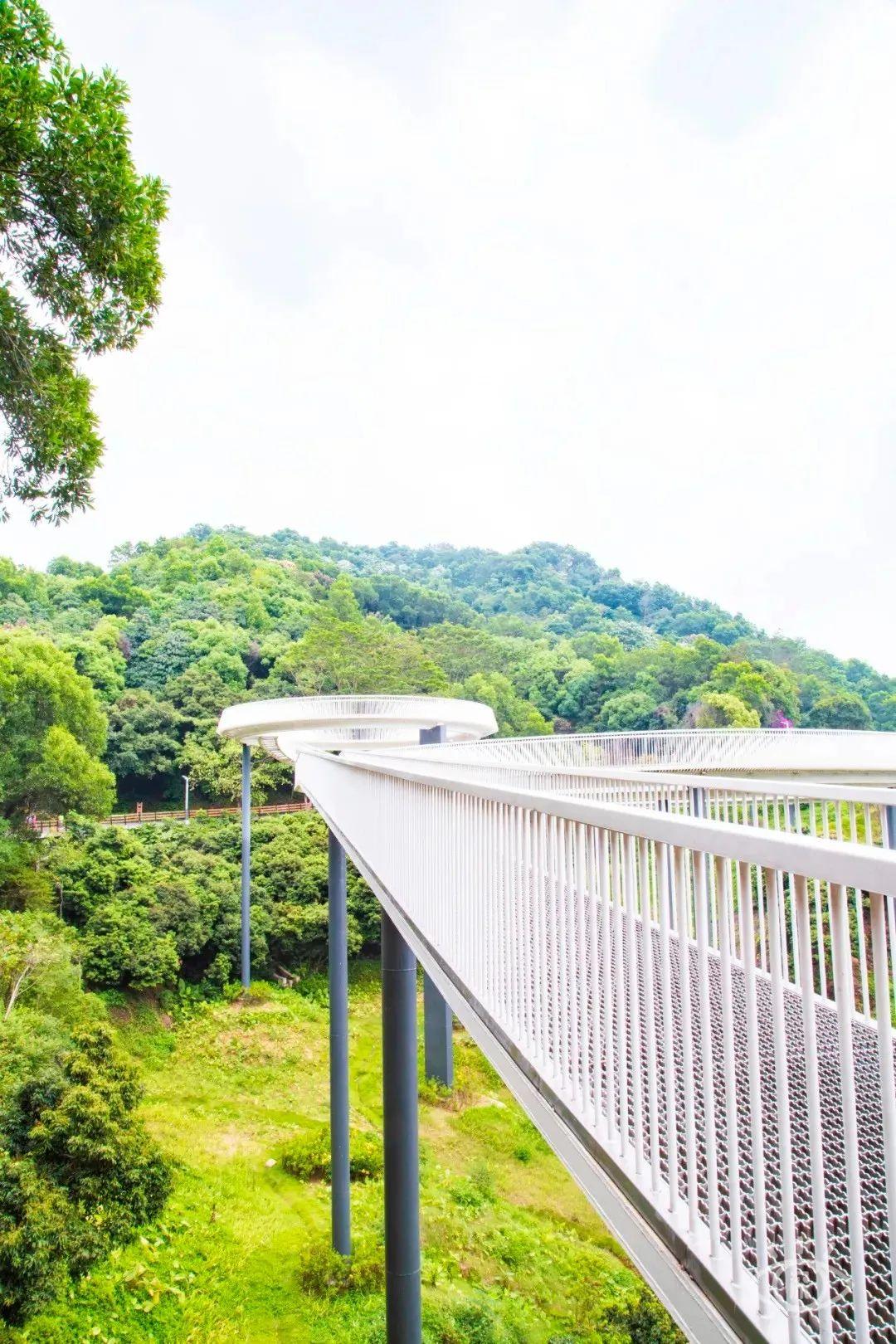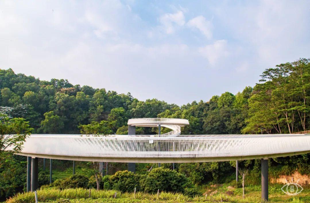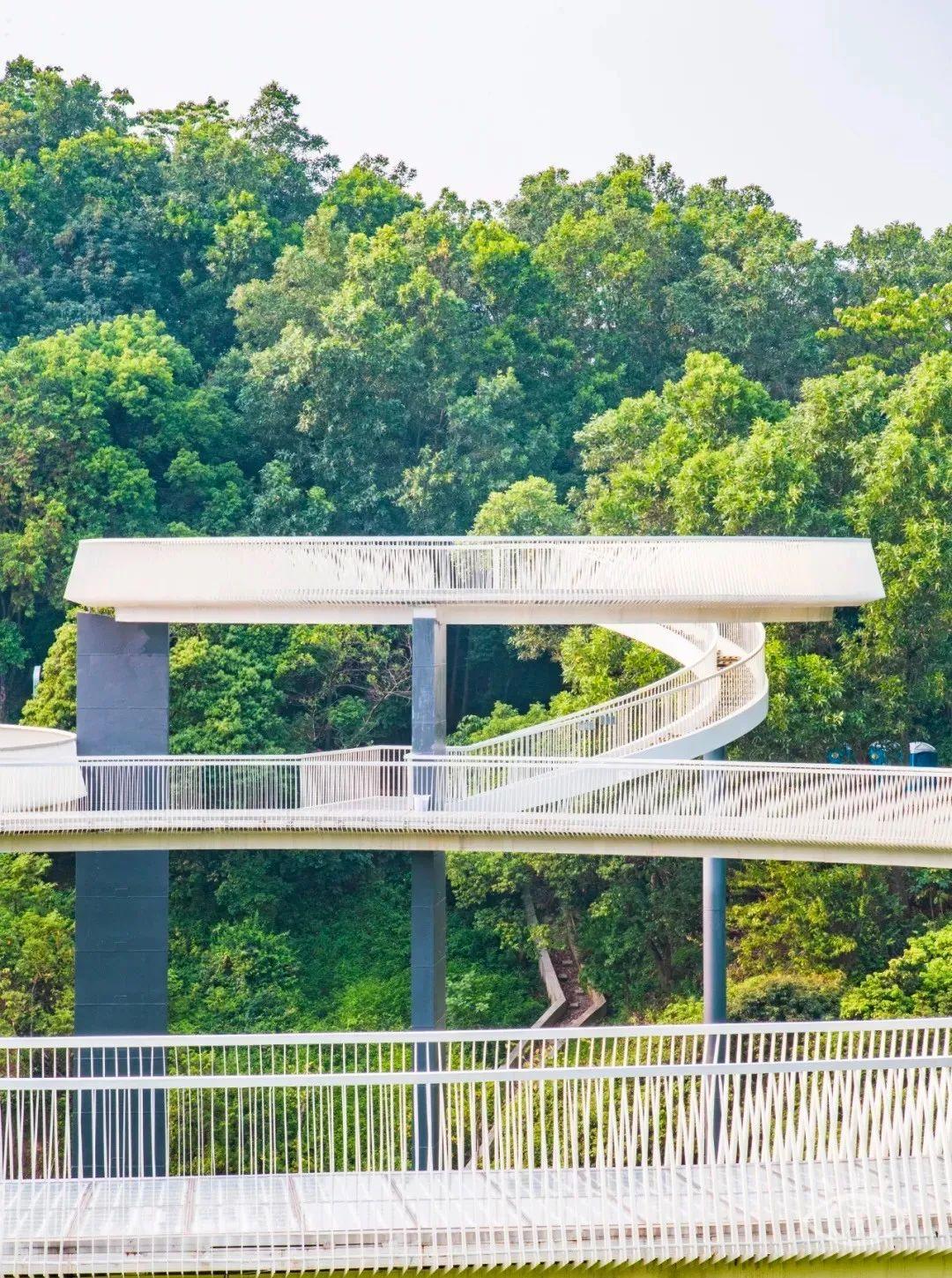 沿着大顶岭绿道走1400米左右,就来到探桥。从高处往下看,探桥特别像一个巨型的"乒乓球拍"。
