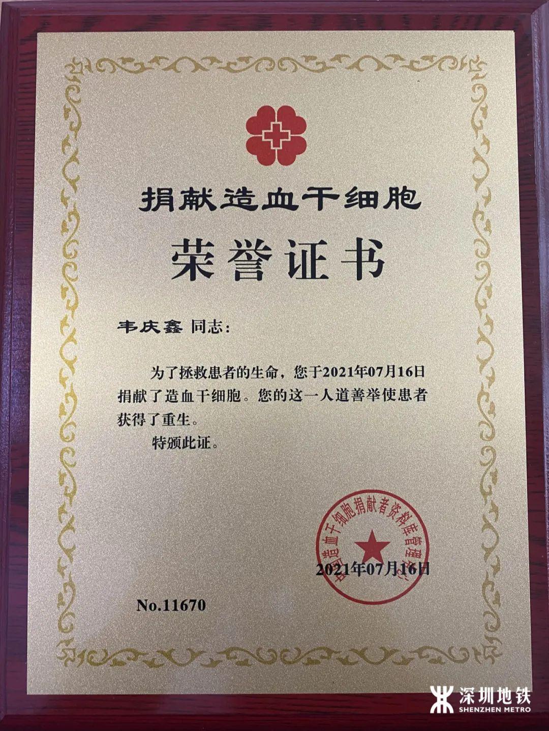 当日,深圳市血液献血服务科副主任蓝欲晓为韦庆鑫和深圳地铁运营集团颁发了荣誉奖牌和感谢状。蓝欲晓表示,多年来,深圳市在造血干细胞捐献救助方面走在全国前列,这需要感谢深圳市民积极奉献爱心事业,也感谢像深圳地铁这样的国有企业能够鼓励员工参与爱心救助并为此提供大力支持。血液中心表示,希望将来能够与深圳地铁达成力度更大、覆盖更广的公益合作,共建深圳爱心之城。