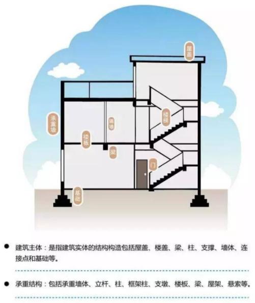 【1】建筑主体是指建筑实体的结构构造,包括屋盖、楼盖、梁、柱、支撑、墙体、连接接点和基础等。