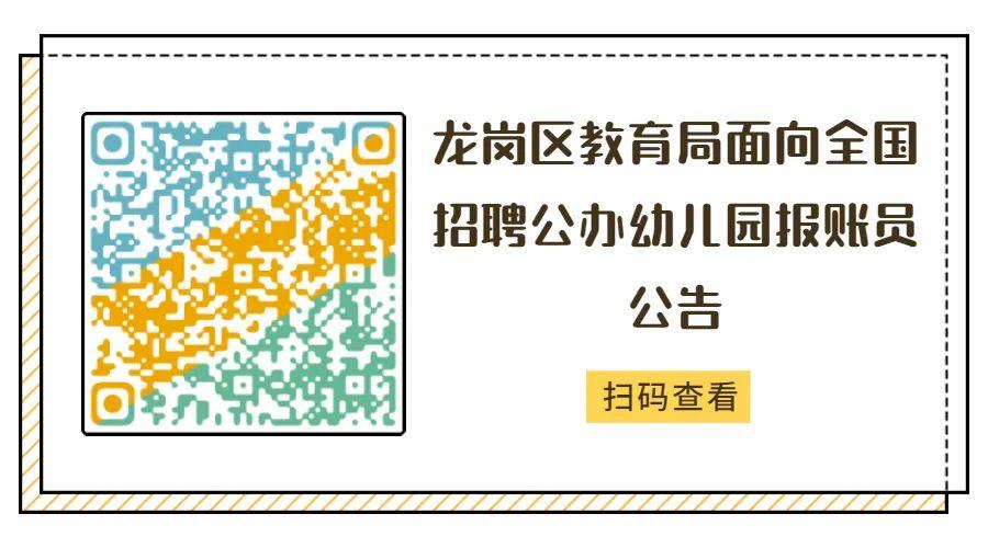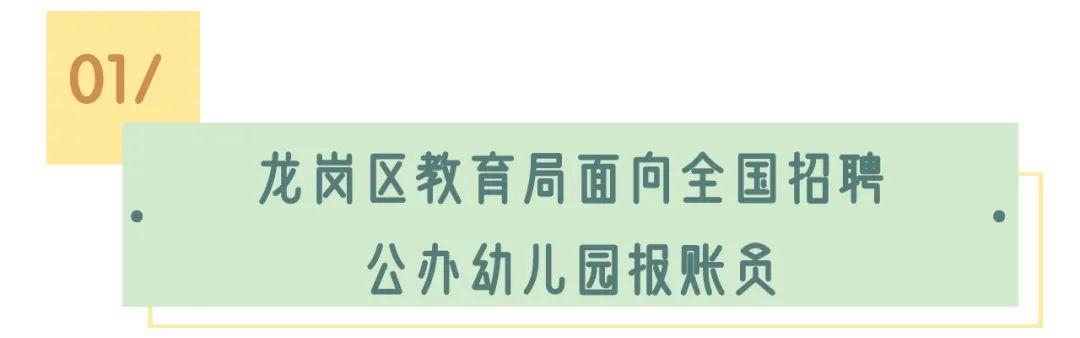 为进一步加强龙岗公办幼儿园建设,现面向全国公开招聘公办幼儿园报账员,报账员A类(社会人员)40名;报账员B类(应届毕业生)30名;人员性质为非在编合同制聘用人员。