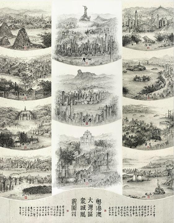 诸彪 《粤港澳大湾区众城风貌图》 176x180cm 纸本水墨 2019