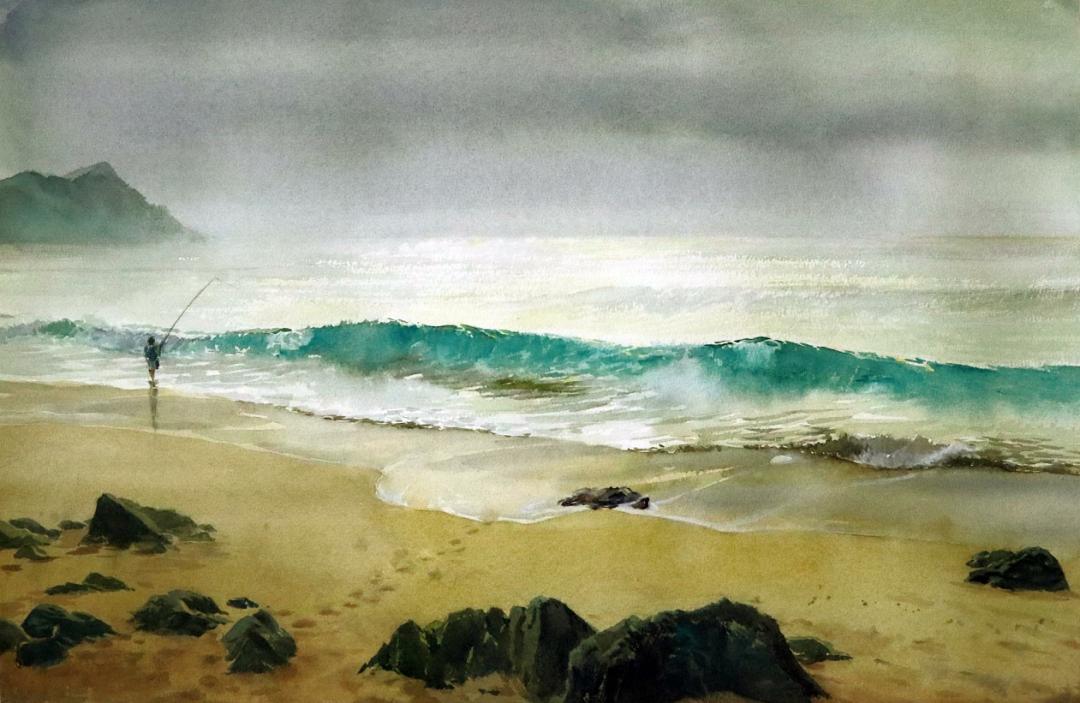 牛建华 《大梅沙海钓》 32x24cm 水彩