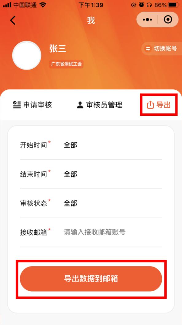 点击“导出”,通过“开始时间”“结束时间”“审核状态”筛选所要导出的数据,输入“接收邮箱账号”,点击“导出数据到邮箱”,接收邮箱可收到导出的数据。