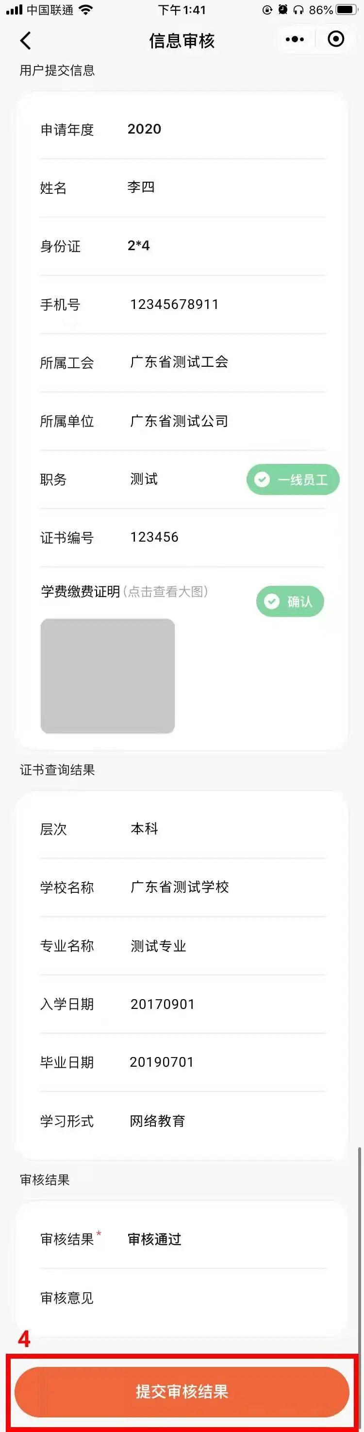 • 选择“审核通过”,点击“提交审核结果”按钮,则提交至所属地市总工会审核;