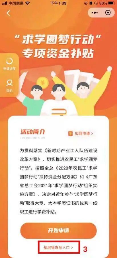 当所属工会内有会员提交申请时,基层工会管理员将收到提醒短信,点击短信内的链接,跳转至“粤工惠津贴发放”微信小程序进行登录后,即可审核。