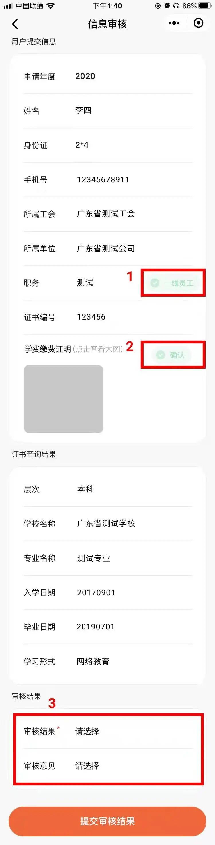 2.在详细申请信息页面,可查看用户提交的相关信息,及大数据中心返回的查询结果信息。基层工会管理员需要: