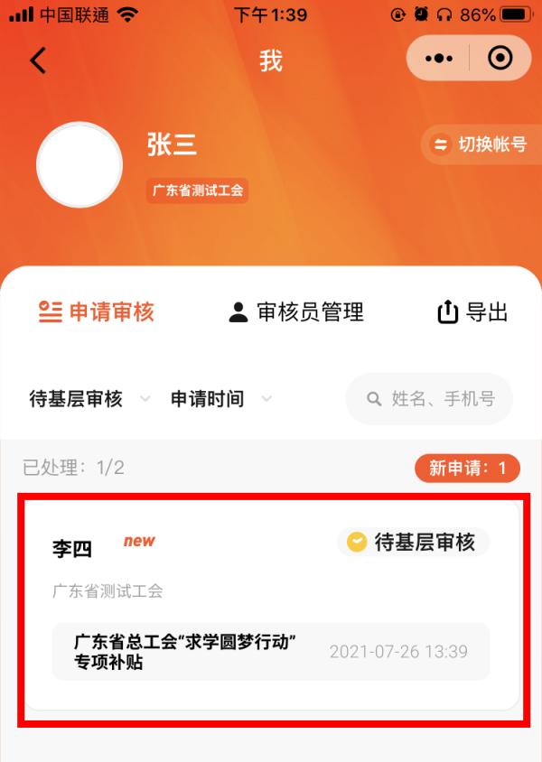 1.点击“申请审核”,查看当前所属工会内所有的申请信息及当前的状态。