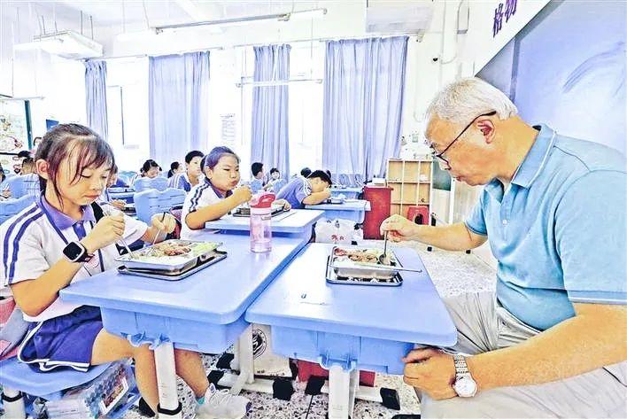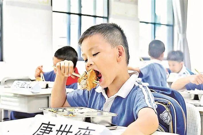 “今天的菜超级好,有牛排、西红柿炒蛋,还有小糕点!”午餐时间到,王景烽同学第一个领到餐盒,打开之后立即广而告之……