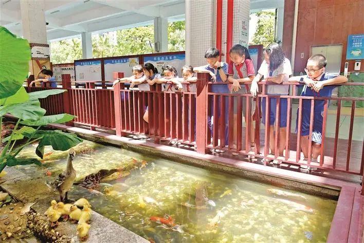 图书馆吸引托管学生的还有一旁的小生物馆,玻璃橱窗内饲养着3条蜥蜴,同学们争睹蜥蜴享用面包虫。课间休息时间,同学们则跑向紧邻图书馆的景观池,隔着护栏欣赏池内的绿树假山,以及成群的锦鲤、乌龟和呆萌可爱的小鸭子。“太美了,简直像个小型动物园。”