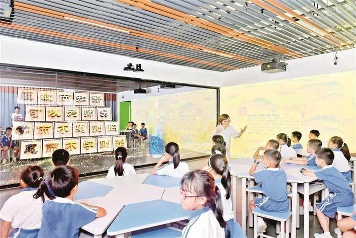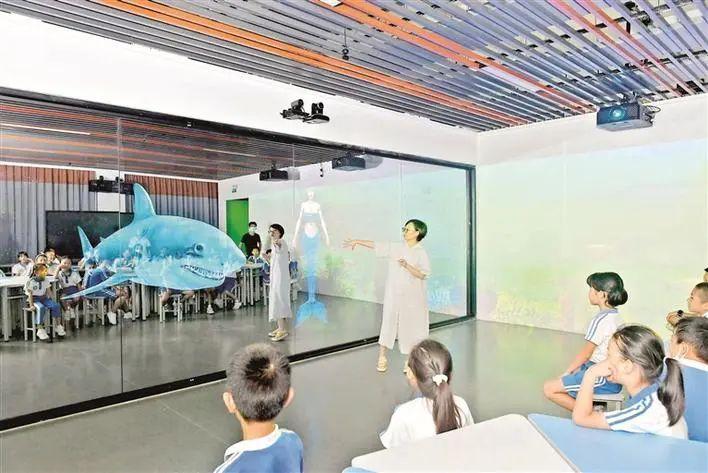 22日上午,参加宝安中学(集团)实验学校暑期托管的外校学生,首次走进5G全息未来教室。在跟班老师的指引下,大家齐声诵读国学经典,隔空与古人对话;接受海洋生物教育,并与海洋生物互动……