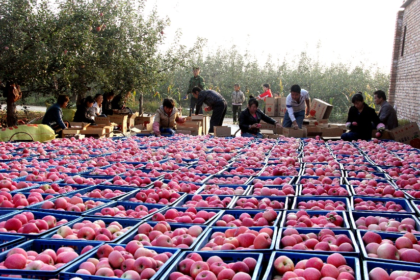 黄陵县隆坊镇果农对苹果进行分拣。郭卫星摄(照片由黄陵县县委办公室提供)