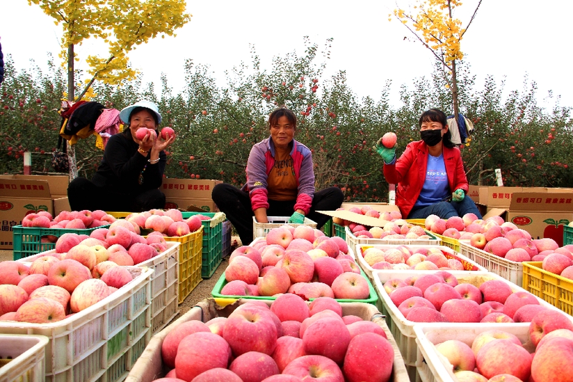 资料图:在延安市黄陵县隆坊镇上官村,工作人员在分拣苹果。新华社发(张博文摄)