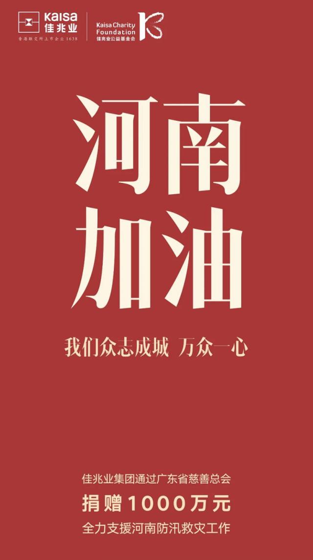 7月22日,佳兆业集团通过广东省慈善总会捐赠1000万元人民币,全力支援河南省防汛救灾工作,捐赠将主要用于保障当地群众生命财产安全、采购救灾物资和灾后重建工作。