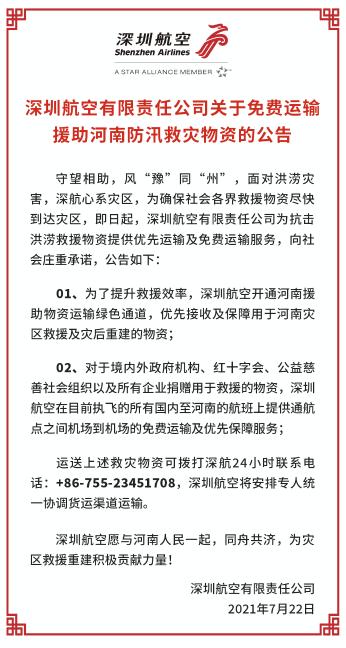 守望相助,风“豫”同“州”,面对洪涝灾害,深航心系灾区,为确保社会各界救援物资尽快到达灾区。7月22日起,深圳航空有限责任公司为抗击洪涝救援物资提供优先运输及免费运输服务: