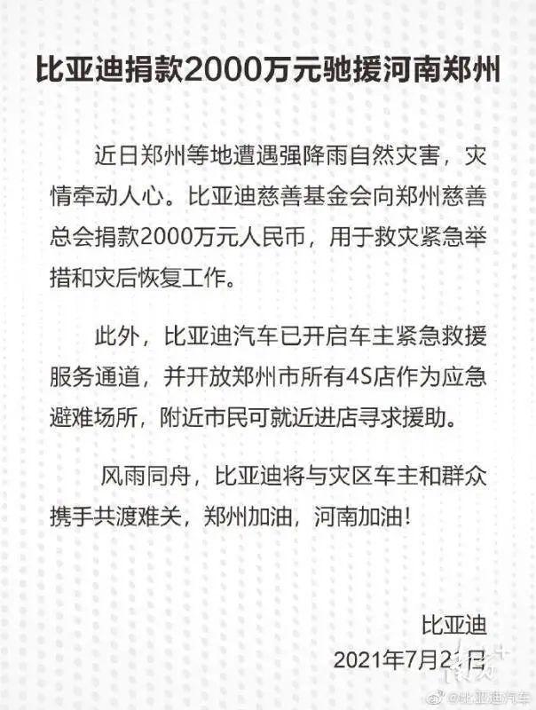 7月21日16时许,比亚迪宣布,比亚迪慈善基金会向郑州慈善总会捐款2000万元人民币,用于救灾紧急举措和灾后恢复工作。此外,比亚迪汽车已开启车主紧急救援服务通道,并开放郑州市所有4S店作为应急避难场所,附近市民可就近进店寻求援助。