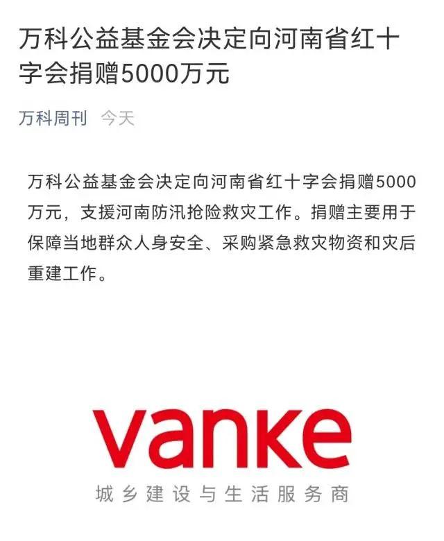7月21日,万科公益基金会决定向河南省红十字会捐赠5000万元,支援河南防汛抢险救灾工作。捐赠主要用于保障当地群众人身安全、采购紧急救灾物资和灾后重建工作。