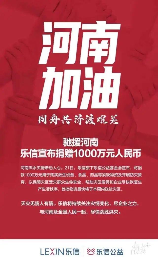 7月21日,在河南防汛救灾严峻形势下,乐信公司宣布,旗下乐信公益基金会将通过中华儿慈会、壹基金、深圳市慈善会等社会组织和机构捐款1000万元人民币,用于保障受灾群众生命安全,帮助灾区居民和企业尽快恢复生产生活秩序。