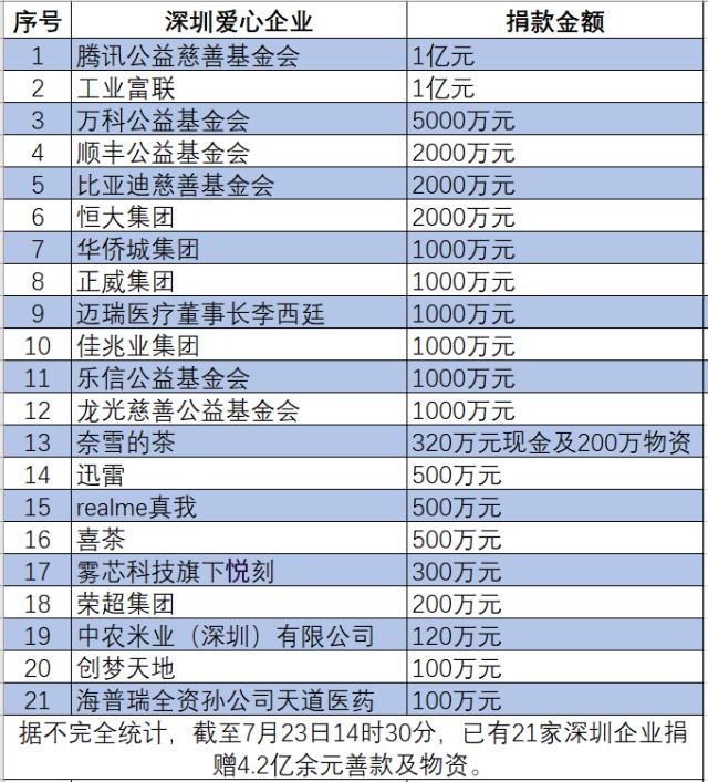 据南方+记者不完全统计,截至7月23日14时30分,深圳企业和企业家已捐赠4.2亿余元善款及物资。