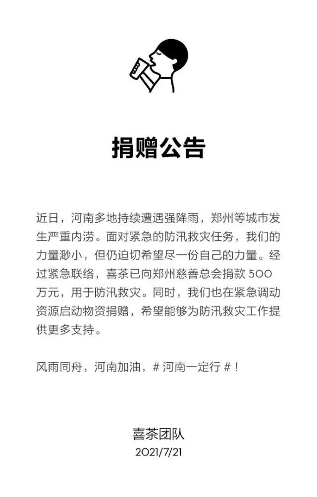 7月21日10时30分,喜茶官方微博发布捐赠公告称,经过紧急联络,喜茶已向郑州慈善总会捐款500万元,用于防汛救灾。同时,我们也在紧急调动资源启动物资捐赠,希望能够为防汛救灾工作提供更多支持。
