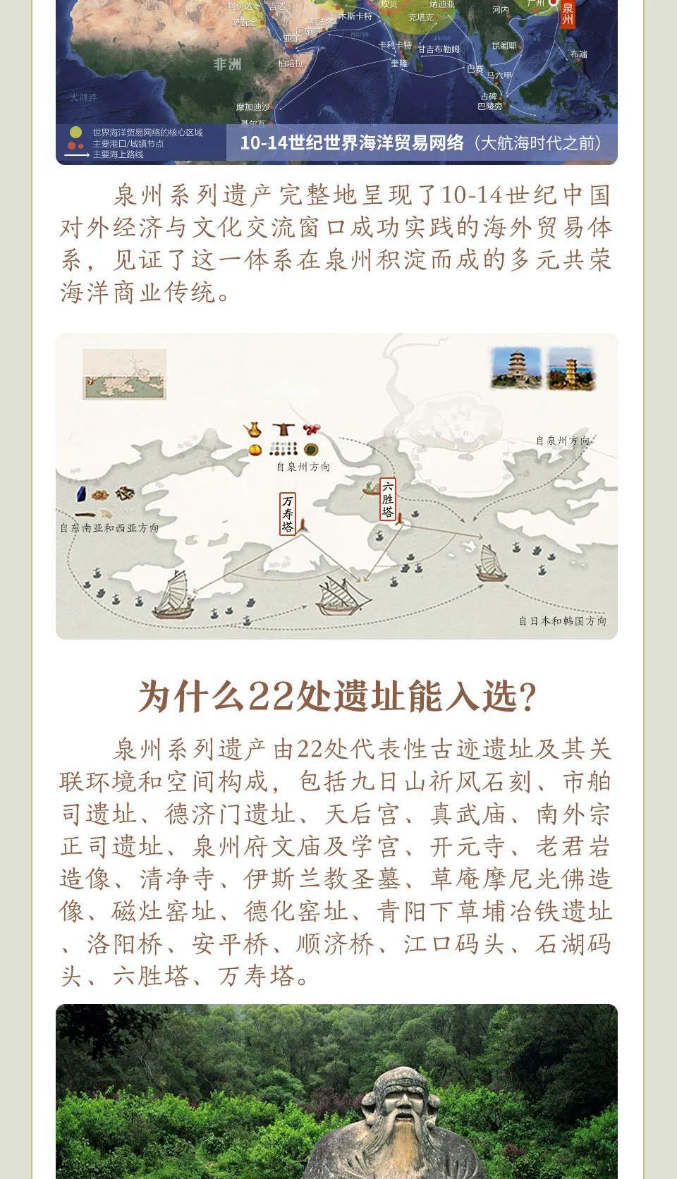 据介绍,本次泉州申遗项目的遗产整体由22处代表性古迹遗址及其关联环境构成,分布在自海港经江口平原并一直延伸到腹地山区的广阔空间内,完整体现了宋元时期泉州富有特色的海外贸易体系与多元社会结构,多维度地支撑了“宋元中国的世界海洋商贸中心”这一价值主题。