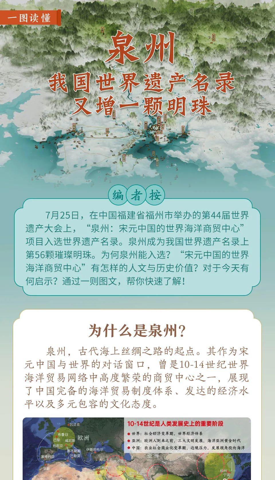 25日,我国世界遗产提名项目“泉州:宋元中国的世界海洋商贸中心”顺利通过联合国教科文组织第44届世界遗产委员会会议审议,成功列入《世界遗产名录》,我国世界遗产总数升至56项。