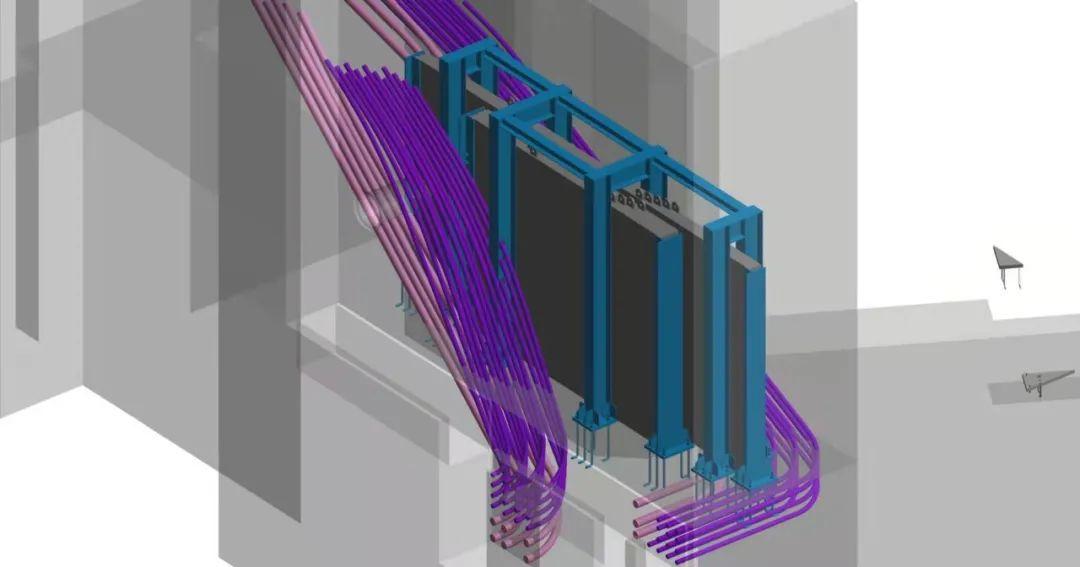同时,项目BIM中心实时建立混凝土结构、内嵌钢板及整套扶壁体系、机电预埋管线、墙体钢筋的三维模型,将冲突点提前沟通解决,确保安装时无冲突。