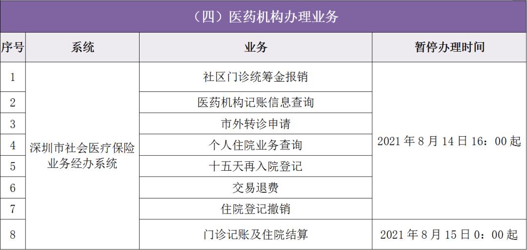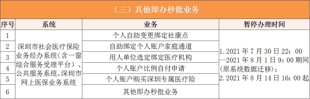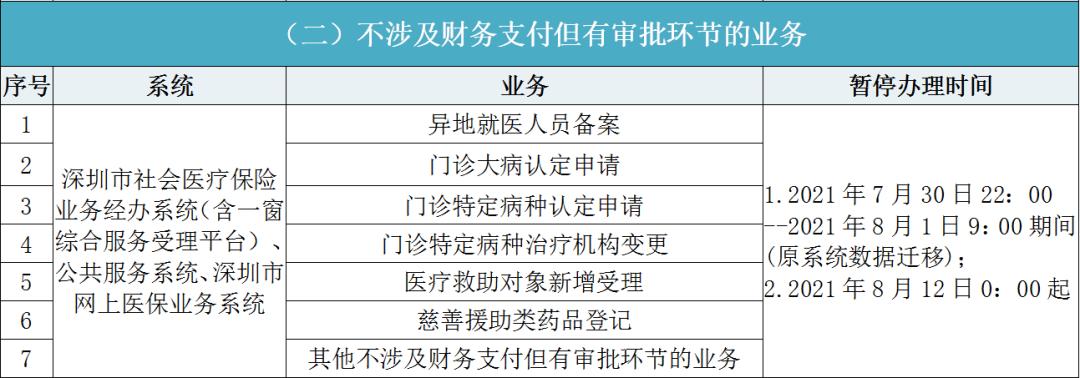 按照国家医疗保障局和广东省医疗保障局的统一部署,深圳市定于2021年8月15日0:00停止深圳市社会医疗保险业务经办系统(以下简称“原系统”)服务功能,进行系统切换,2021年8月17日8:00正式启用国家医疗保障信息平台(以下简称“国家平台”)。