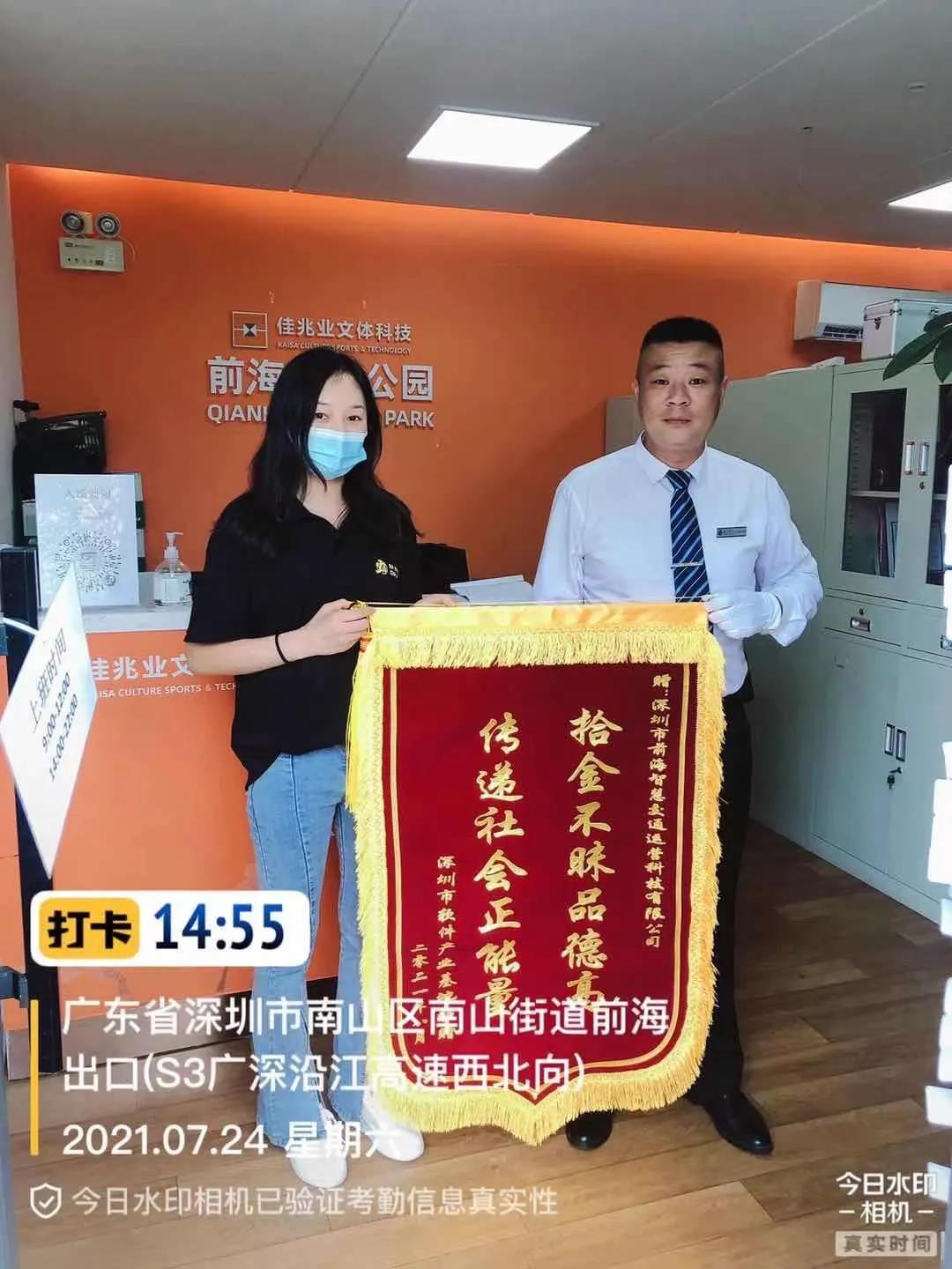 读特客户端·深圳新闻网2021年7月28日讯(记者 吕攀)近日,前海智交公司运营项目值班人员在日常巡查过程中拾获一个装有大量现金、手机、证件等贵重物品的手提袋,随后,值班人员积极通过调取监控、信息查询等多途径寻找失主归还物品。面对失主的感谢,值班人员直言“这都是举手之劳,我和同事在工作期间经常会遇到此类事件,只要群众有需要,我们就竭尽所能。”为表达感谢之情,7月24日下午,失主专程赠送一面印有“拾金不昧品德高传递社会正能量”锦旗,高度赞扬智交公司运营团队拾金不昧的正能量。
