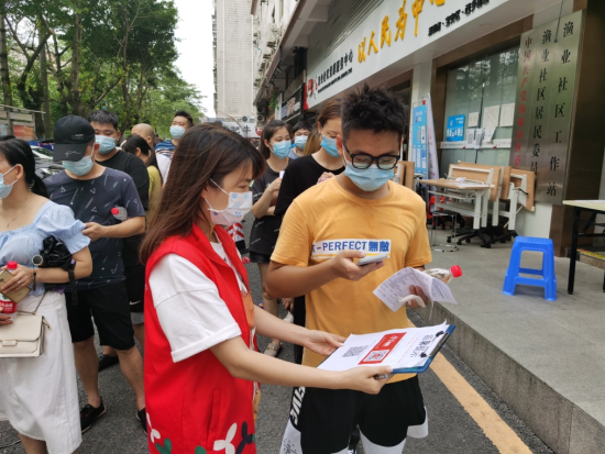 深圳市宝安区西乡街道渔业社区党委利用群众做核酸检测排队时间宣传推广“学习强国”。供图/西乡街道